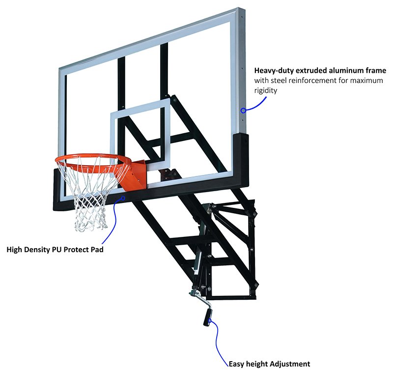 ● 篮板是1/2“比赛用全钢化玻璃制成,安装在专属H型框架上